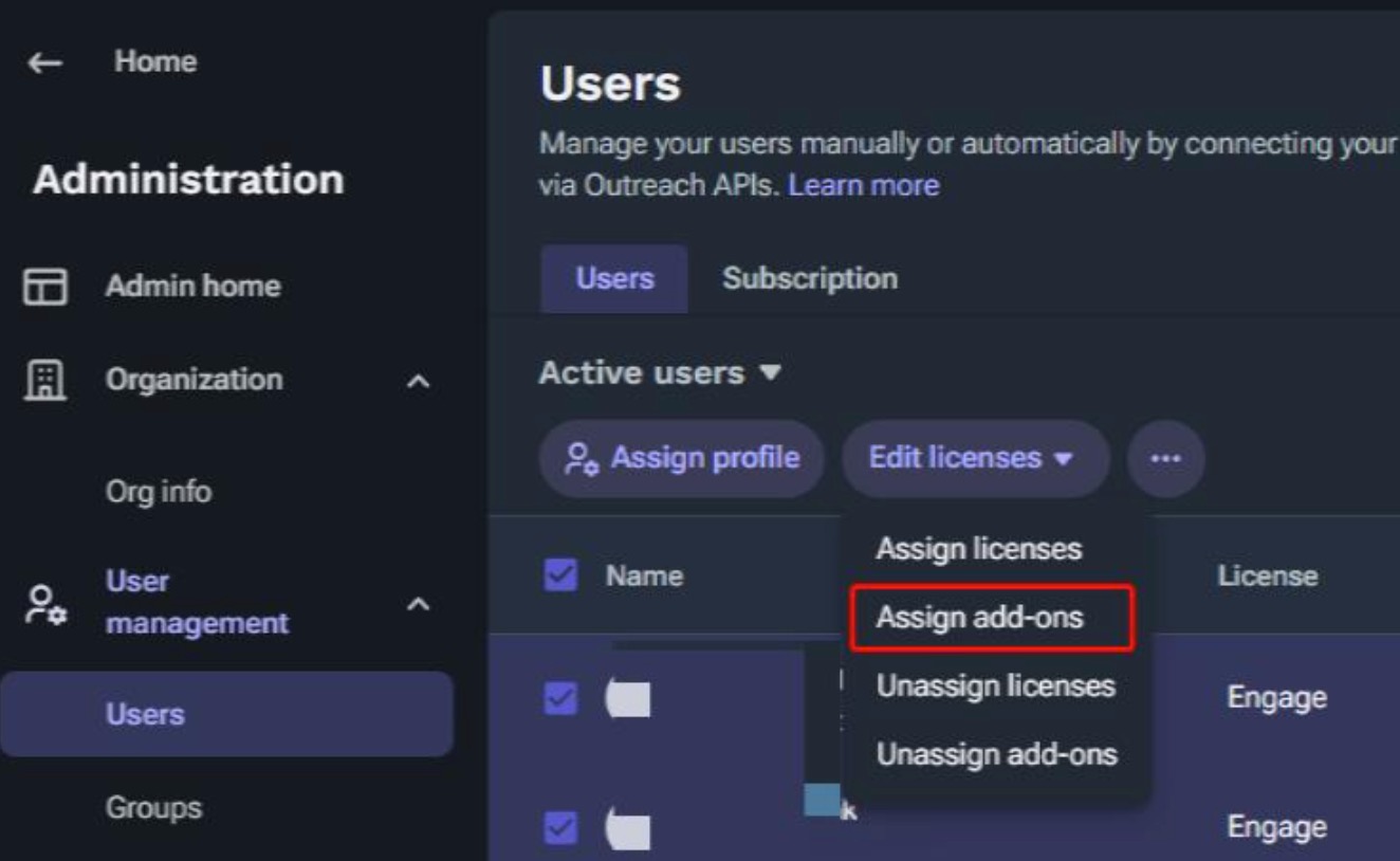 Click Edit license > Assign add-ons.